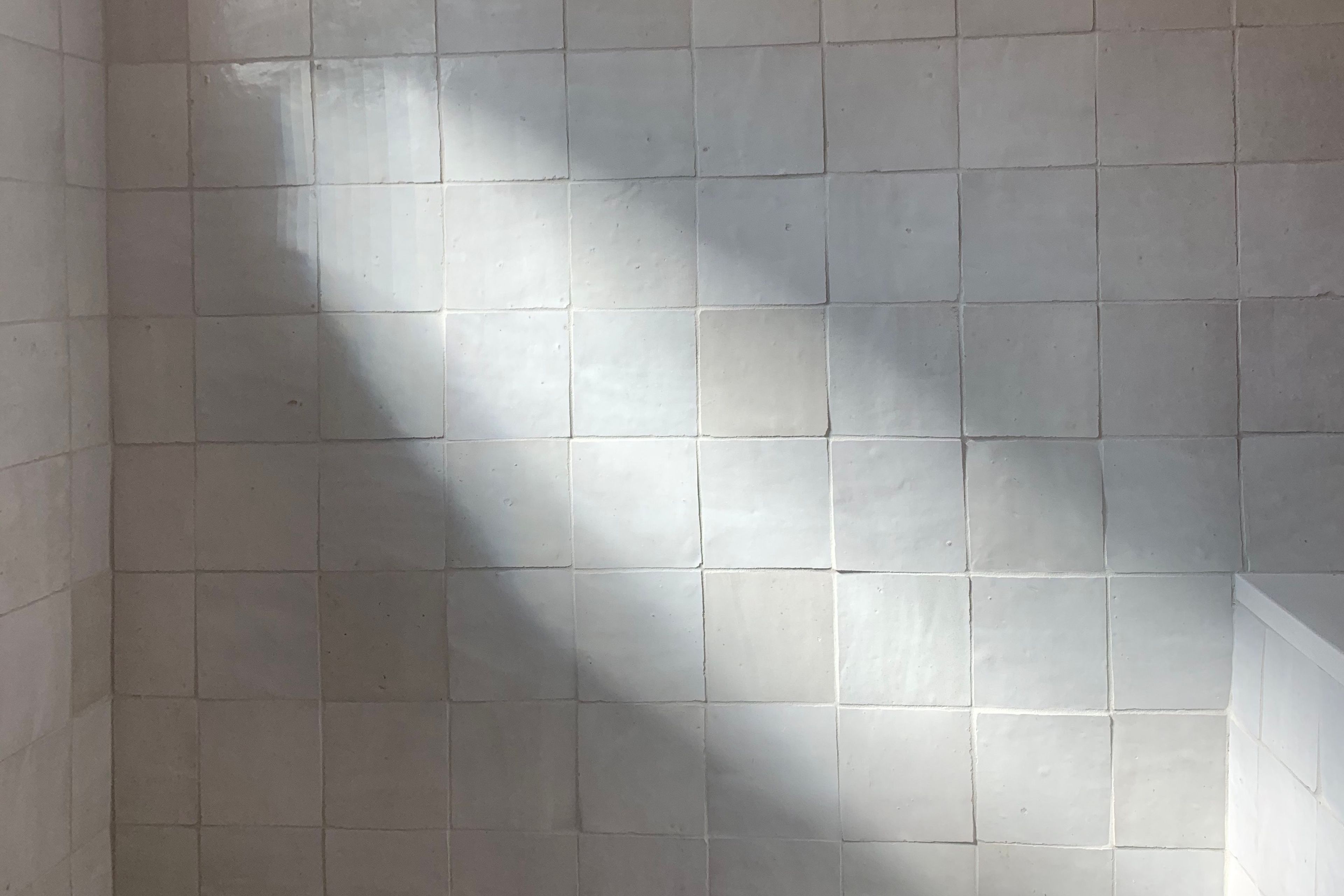 They say zellige tiles are the sequins of the tile world. You'll see light disperses across an imperfect surface, the bumps and grooves of each hand-molded, hand-cut, and hand-glazed tile reflecting its own unique color even if all are labeled white.