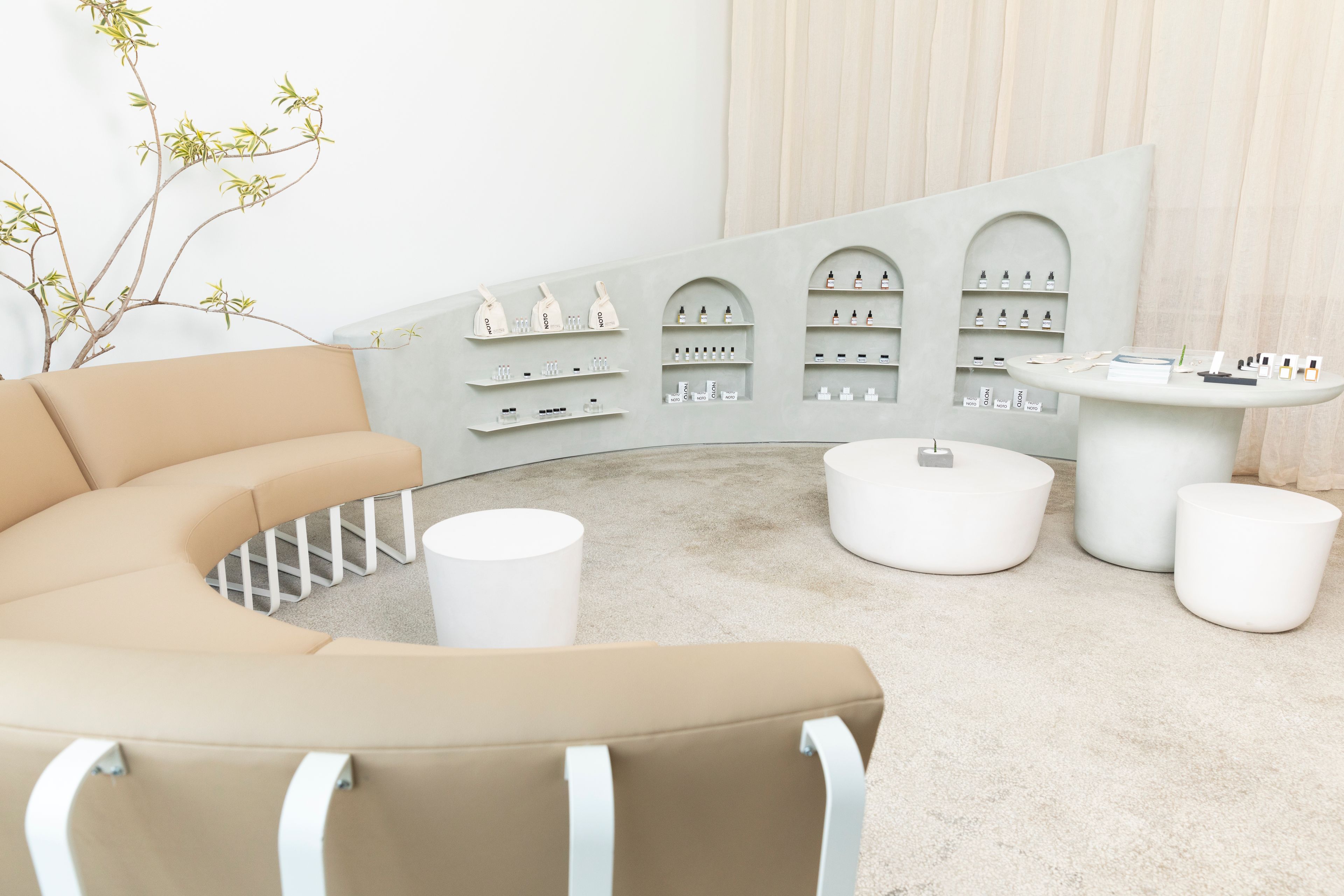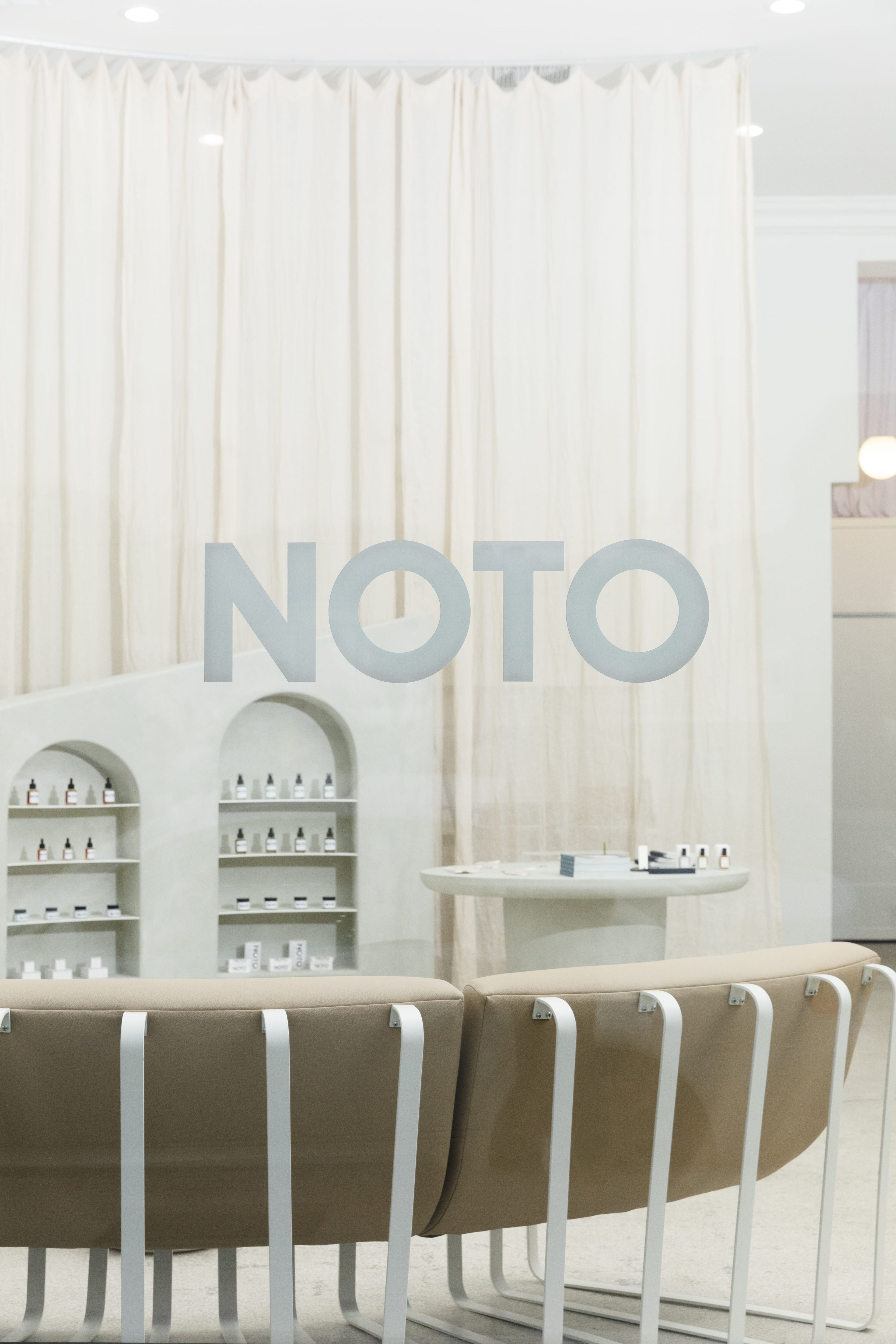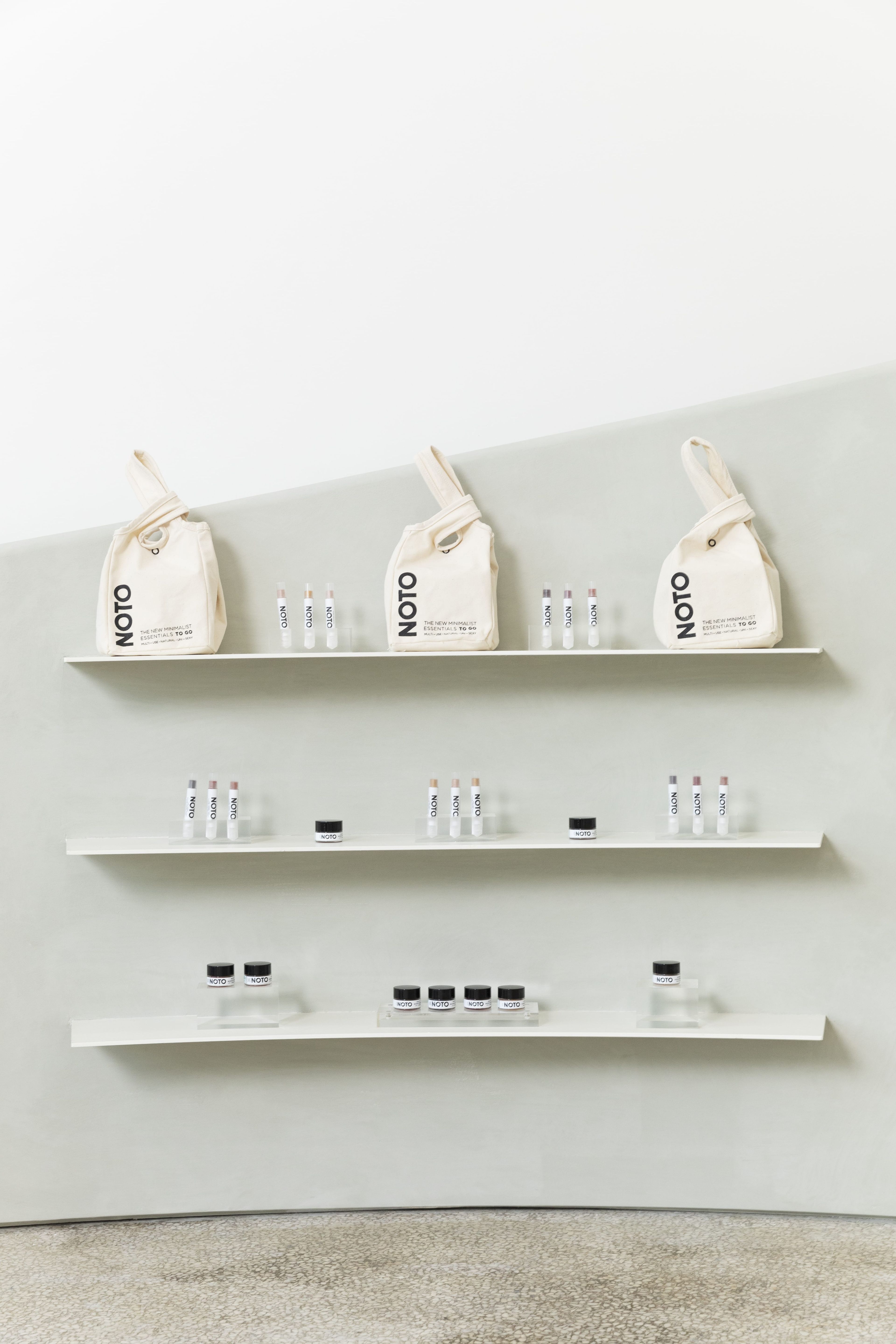 The prominent feature for Noto Botanics is a curved display wall right in the center. A mossy green lime wash finish takes inspiration from the ethos of the brand and signifies vitality and growth.