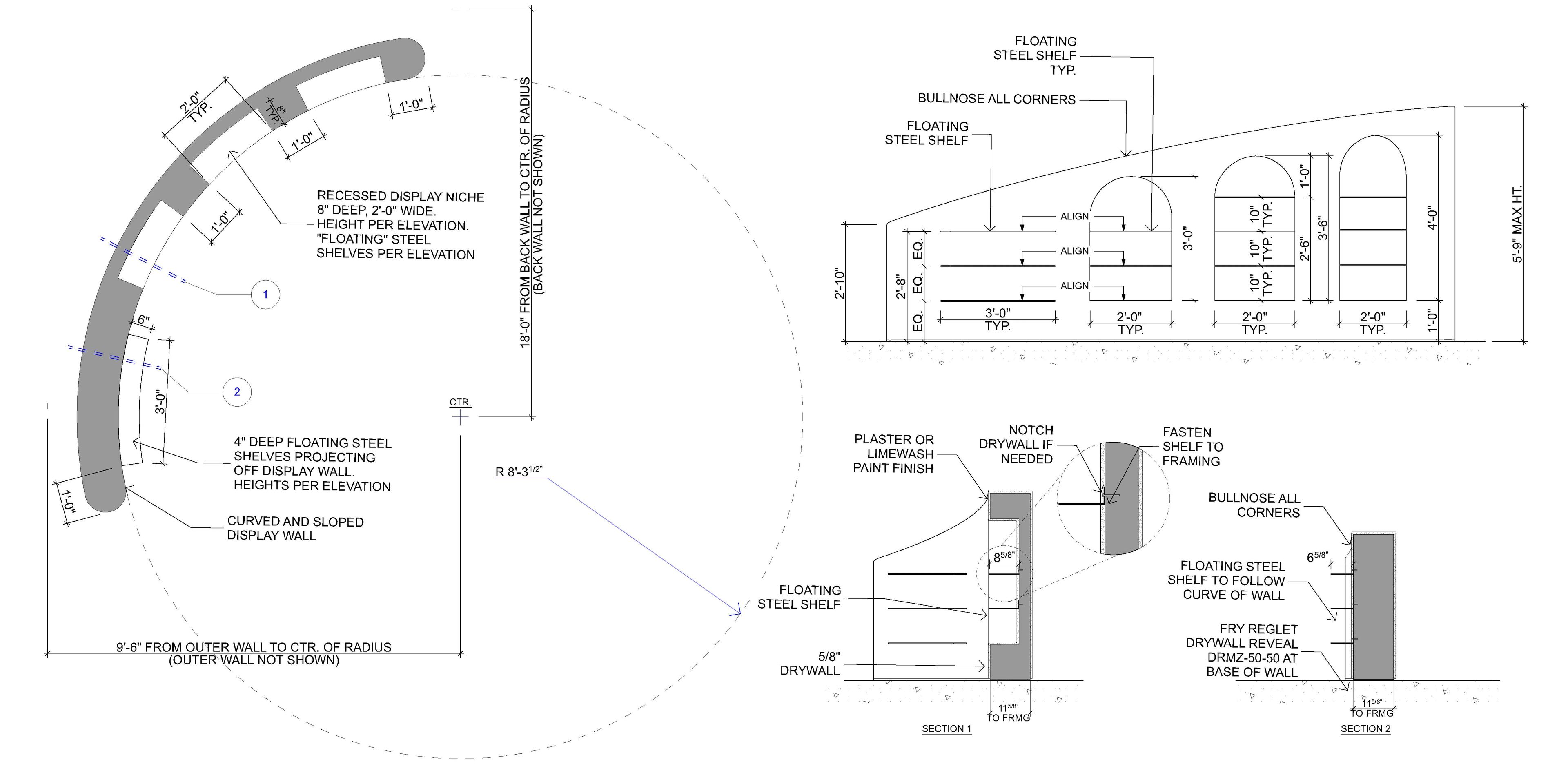 Abutting right against the display wall is the first series of floating shelves projecting out of the wall. These shelves were cut to precise measurements by CNC machines to ensure the radial back edges would eliminate unsightly gaps. Corners are rounded off to ensure no accidental cuts or scraps.