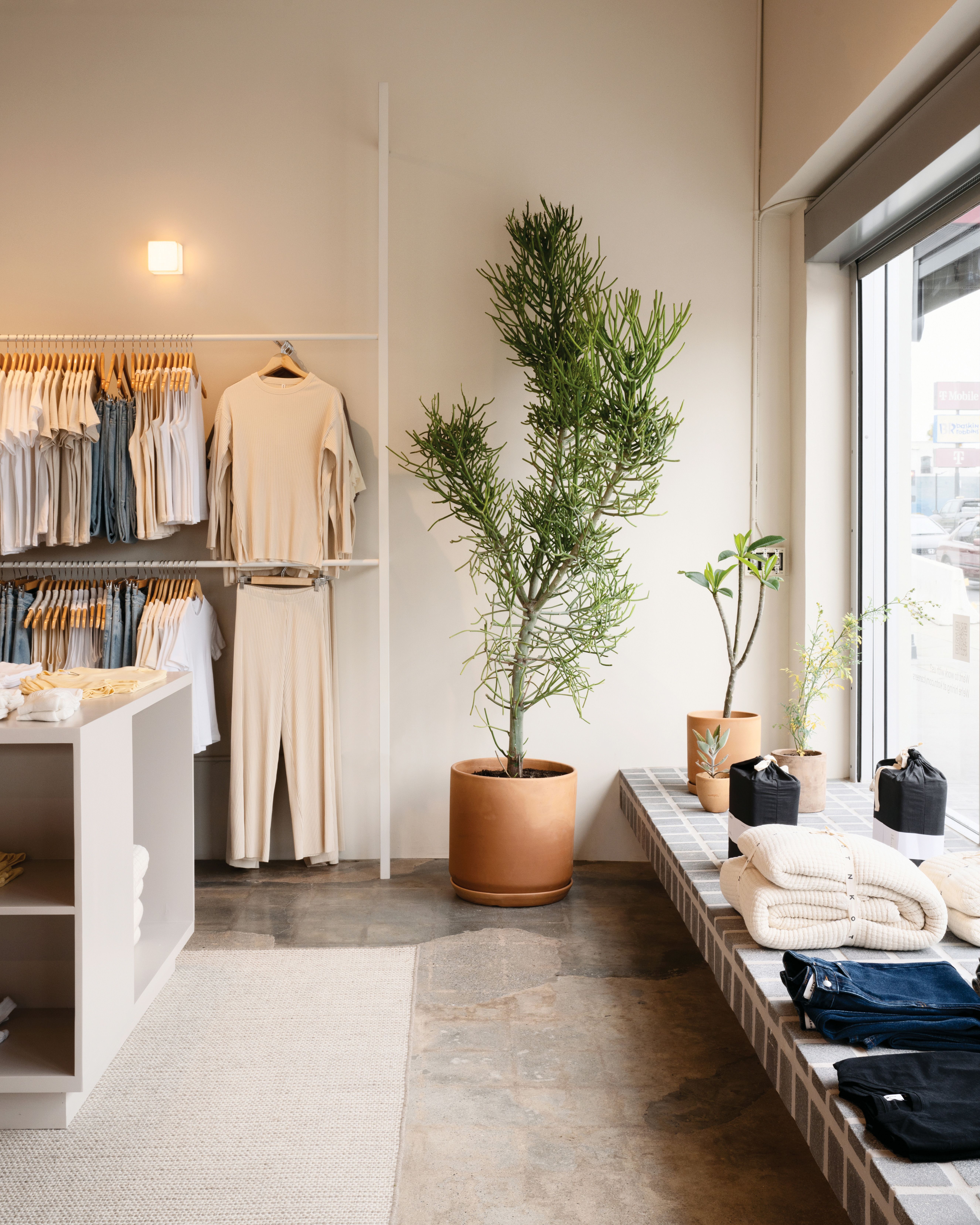 Our team partnered closely with KOTN to translate their ethos into an immersive retail experience. The space celebrates tactile materials and thoughtful details: walls finished in natural plaster, recyclable linoleum flooring, reclaimed natural cobblestones on the entry benches, and custom display fixtures that allow the textures of KOTN’s clothing and home goods to take center stage.