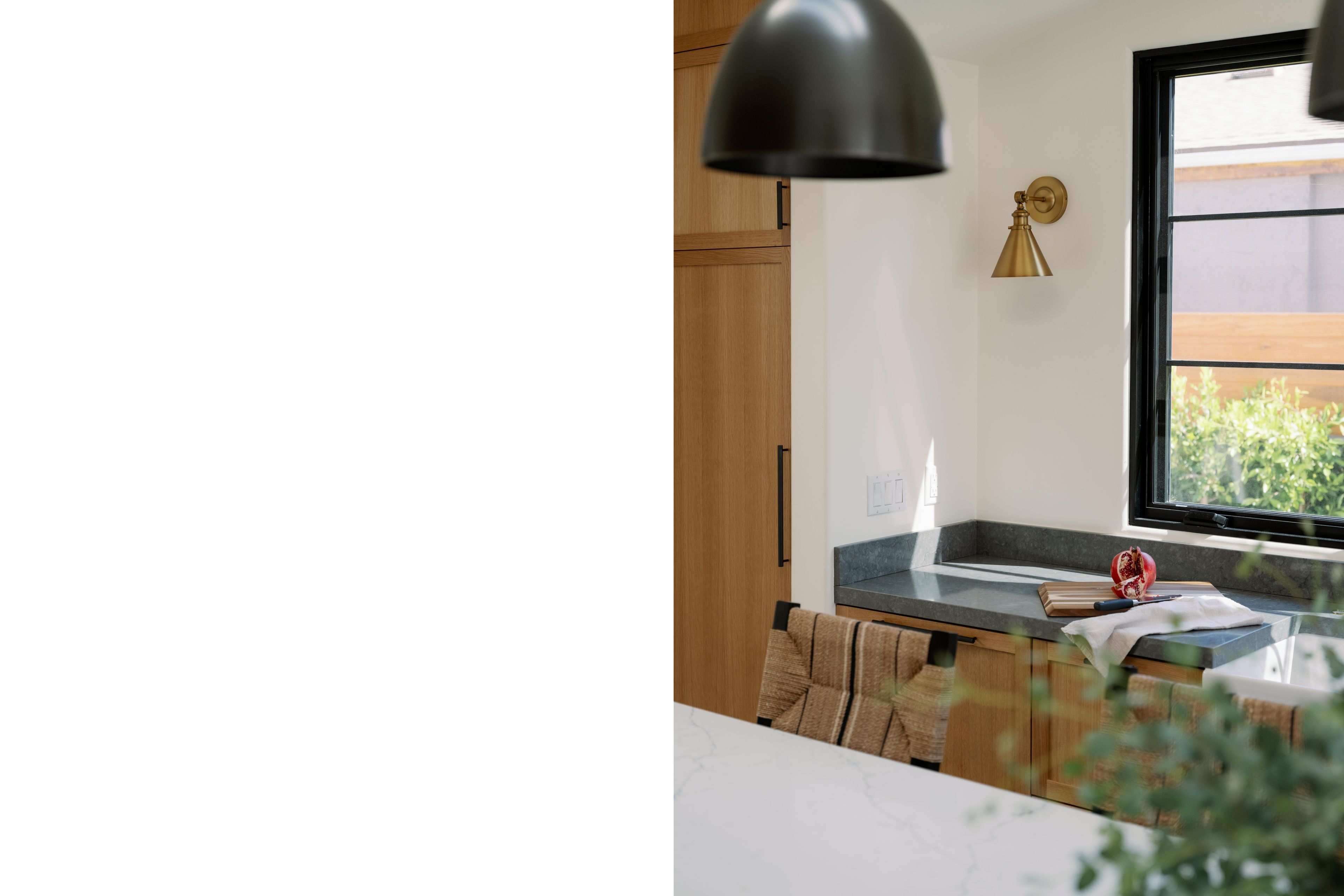The design goal was to enhance the bungalow character with durable rustic-yet-modern materials and amenities. Stone floors, custom white oak cabinets, touches of brass. A real chef's kitchen, top of the line appliances, storage, storage, storage, and custom steel and glass partition doors to keep the couple's two pups out of the kitchen during working hours. The updated floor plan highlights a central axis view from the front door right on through the back door to the new courtyard and entertainment deck. An aptly sized fireplace keeps the deck warm and cozy and the new detached ADU is fit for entertainment and guests alike. We can't wait for the first dinner party invite.