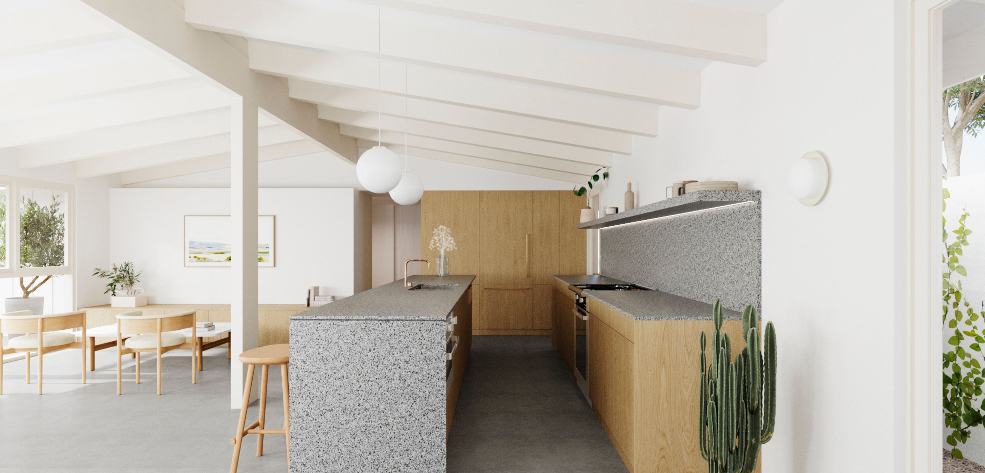 The roof framing remains exposed with a new coat of warm off-white paint standing in subtle contrast to a clean white paint on walls and ceilings. Oak cabinetry and granite give the original worn out veneer kitchen and melamine counters a contemporary rejuvenation. The floors were stripped of years of layered tile and laminate, exposing the original concrete foundation which has been ground and polished. Brass fixtures and hardware complement the warmth of oak and avoids the futuristic Jetsons shine.