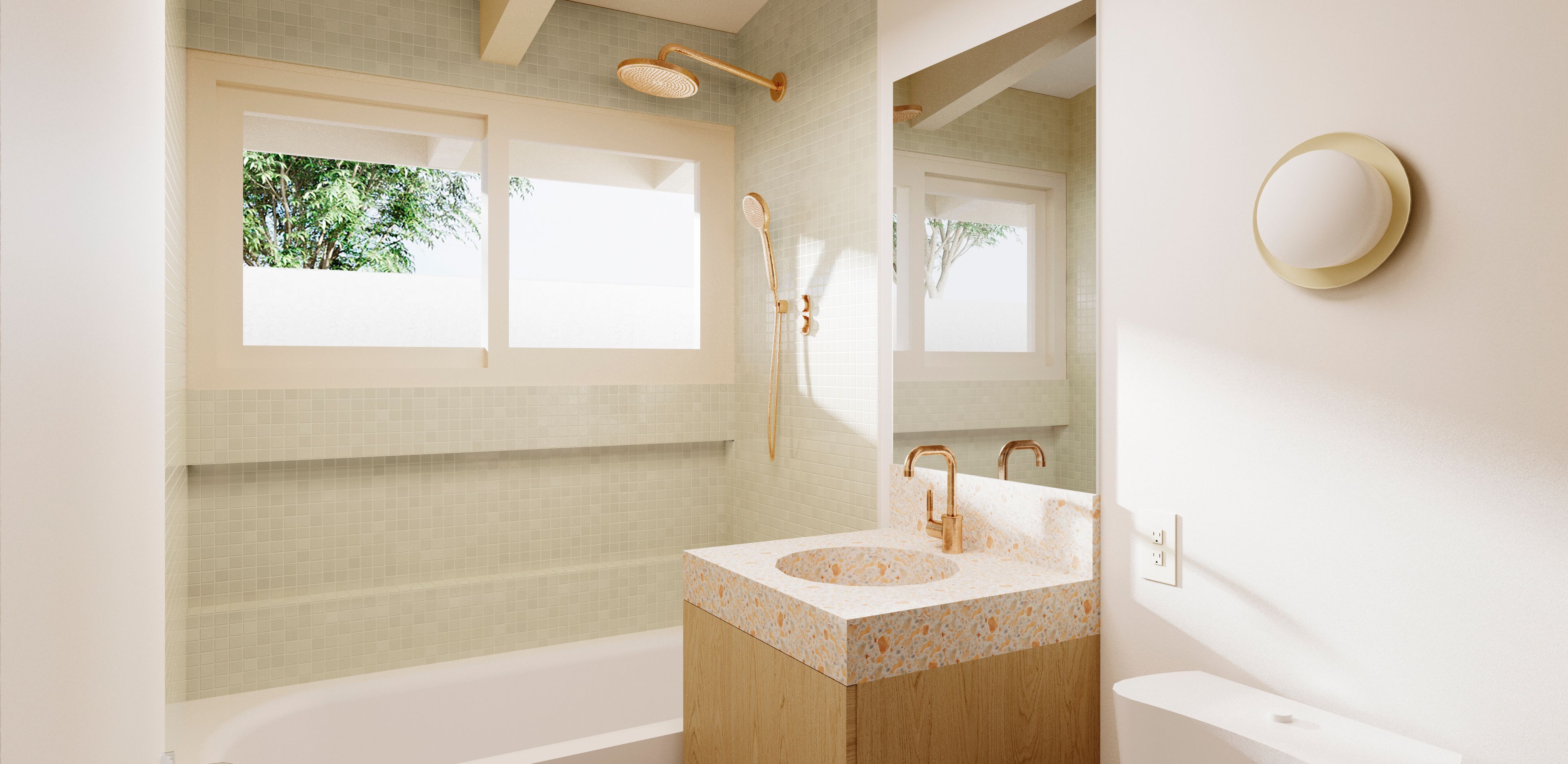 Continuing into the private bedrooms and bathrooms, the same subtle restorative palate is applied. The main bathroom is paired with a light neutral scheme while the guest bathroom is infused with pastel green tiles and a warm terrazzo counter. A spark of color, a splash of vitality.