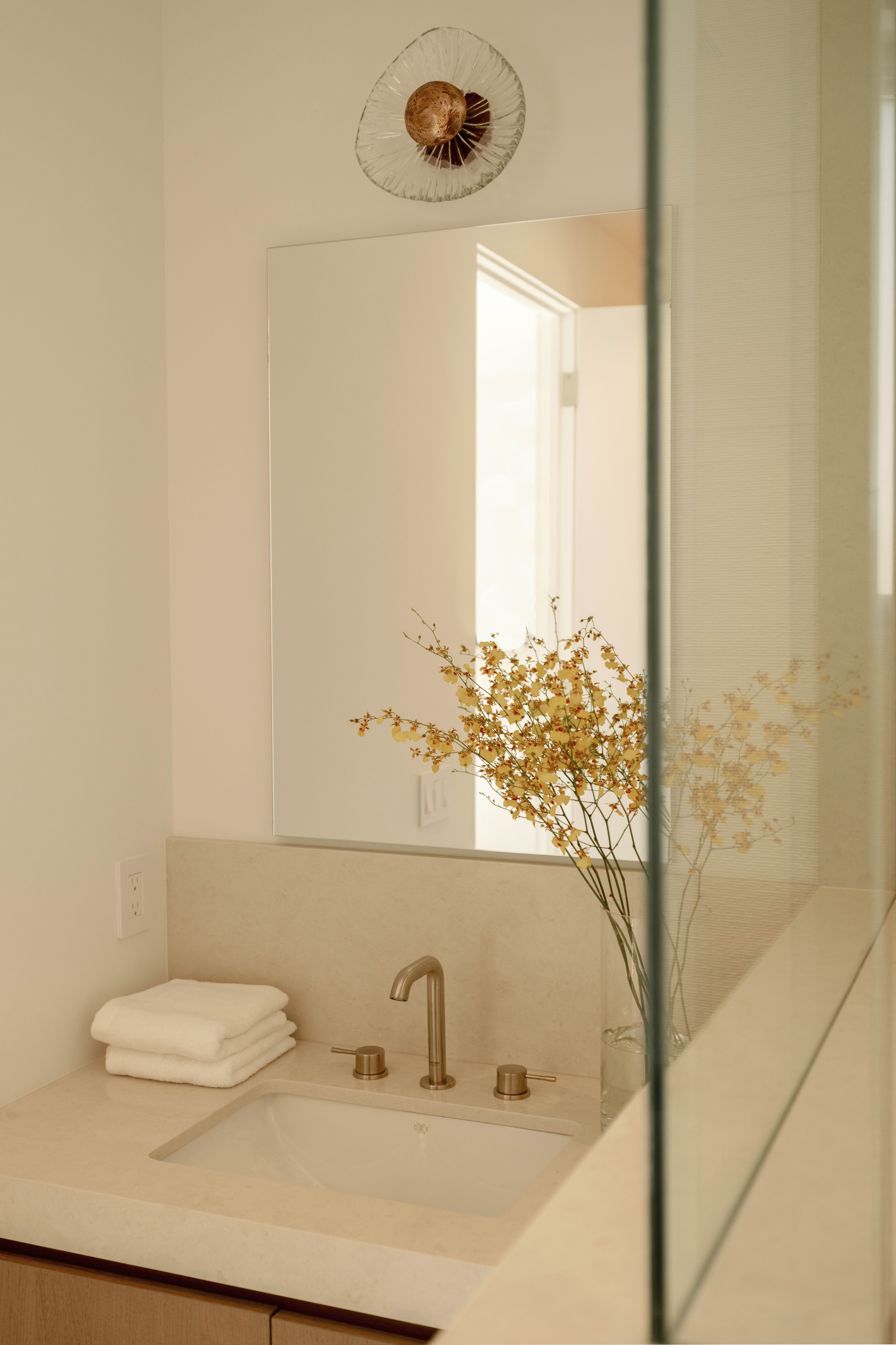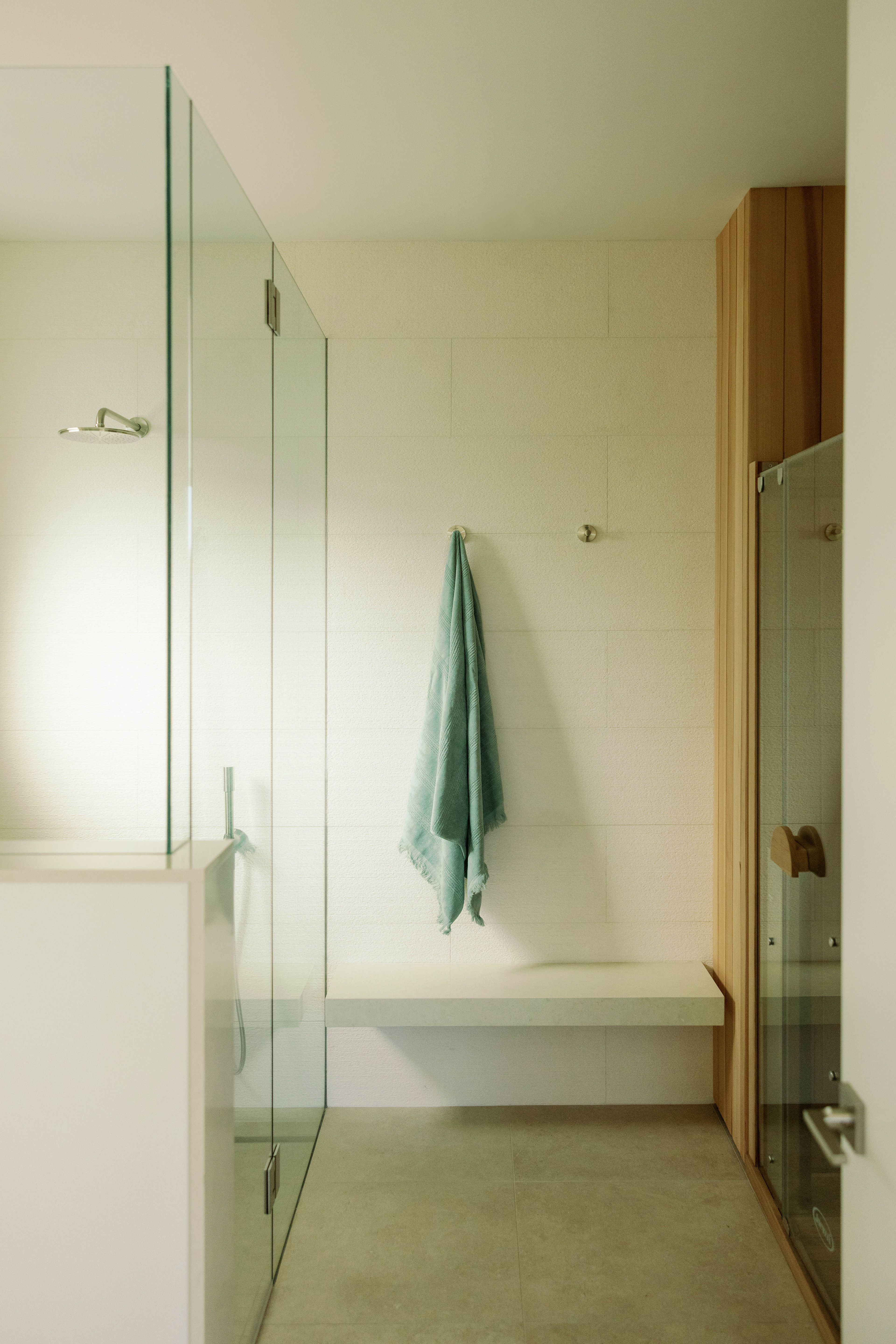 The material palette is comprised of three simple categories: stucco, stone, and wood. Stucco being the defining material in Southern California. The vertical exterior resawn timber grain contrasts with the perfectly imperfect nature of irregularly shaped split face stone and a quiet backdrop of smooth trowel stucco. Inside, white oak floors and American black walnut cabinets adorn the house with a warmth that contrasts the simple yet nonetheless stark white walls and ceilings. Exposed beams break up the banality of an endless plane. Stone counters and tile adjoin wood and white paint with an intermediary surface to be experienced by hand. Wood replaces steel on the stairs for a touch of the human comfort over adherence to strict design ethos.