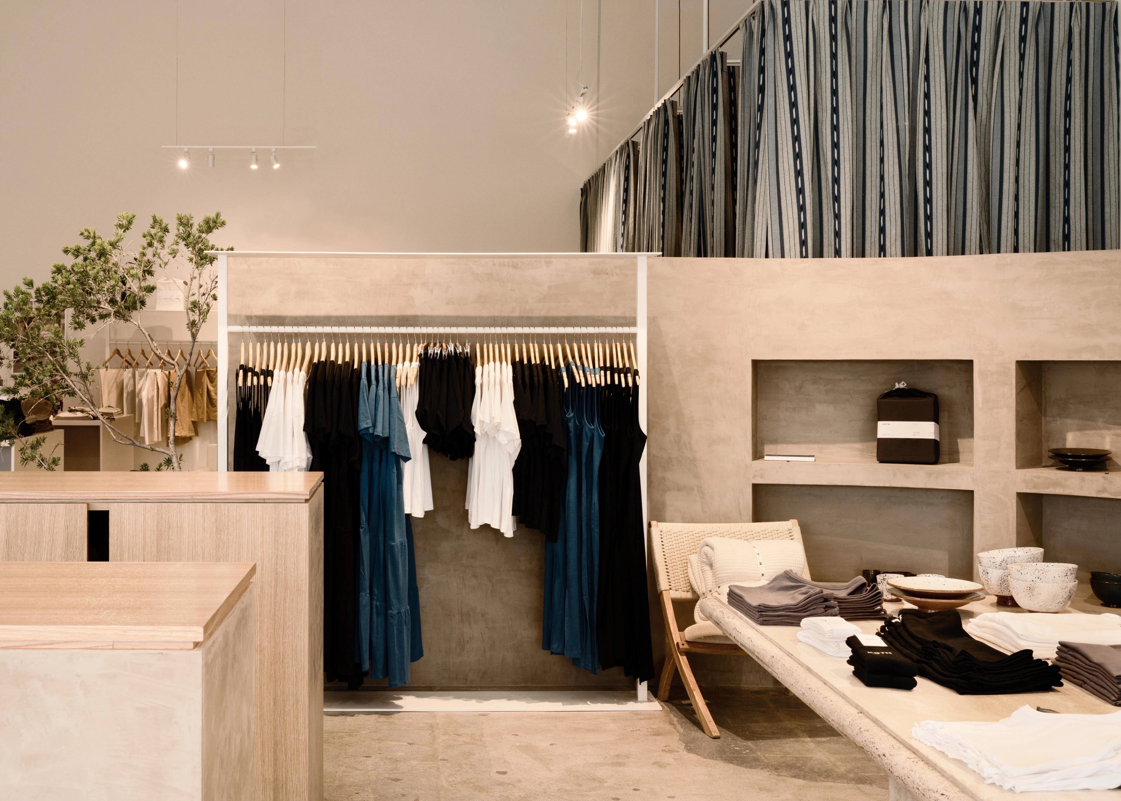 Our team partnered closely with KOTN to translate their ethos into an immersive retail experience. The space celebrates tactile materials and thoughtful details: walls finished in natural plaster, recyclable linoleum flooring, reclaimed natural cobblestones on the entry benches, and custom display fixtures that allow the textures of KOTN’s clothing and home goods to take center stage.