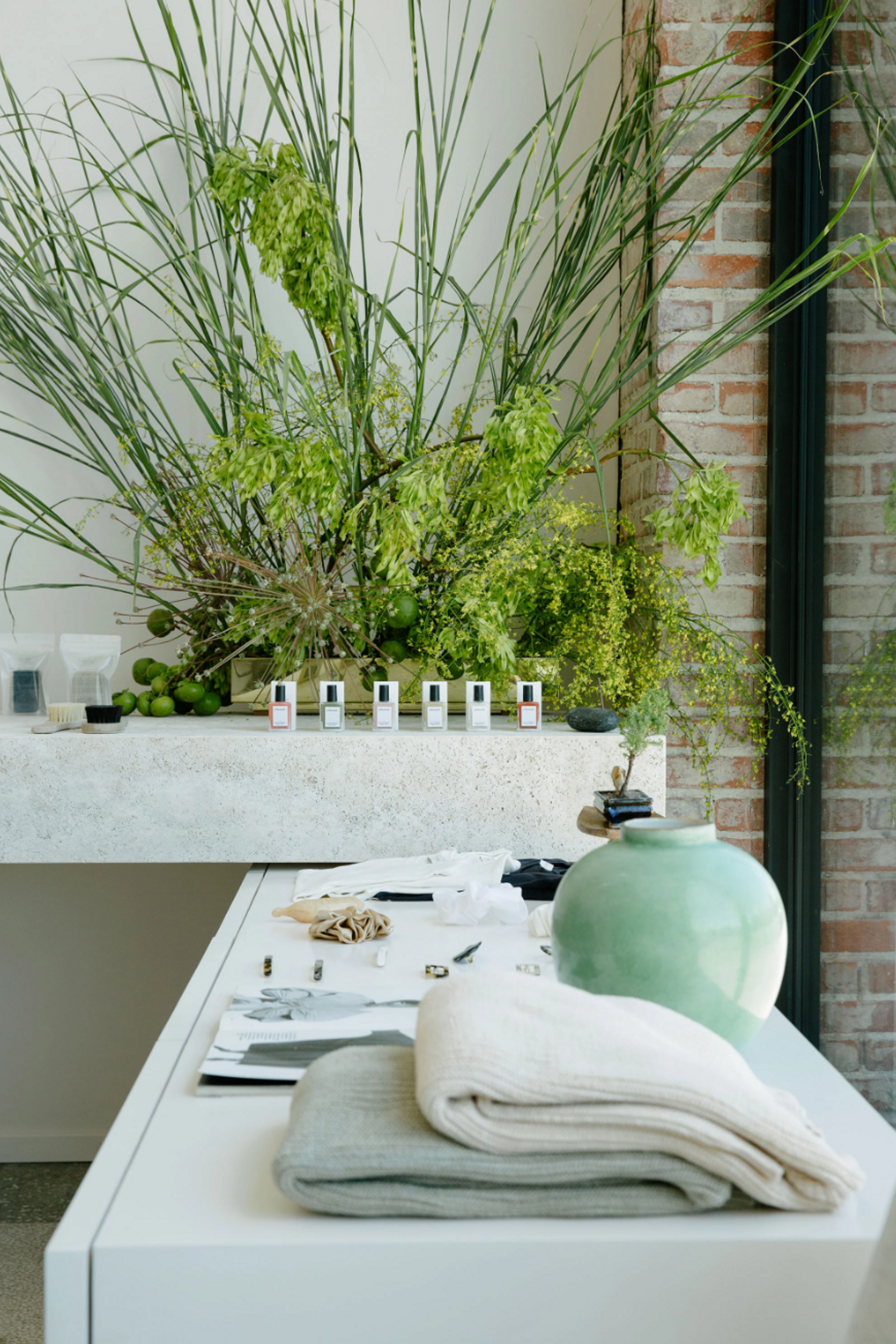 The retail space was treated more like a showroom of sorts. A curving custom brass hanging rail and custom display furniture constructed of organic and textural materials. A travertine slab effortlessly sits atop a custom chrome base to serve as a display area for Mote’s smaller wares. A custom designed daybed is paired with a lacquered storage credenza to create a more casual retail experience. Come in, sit down, have a cup of tea brought back from Mote’s travels to Japan and experience the clothes. The calming palette of beige and creme is accented with found objects like the wooden African headrest, the centuries old Chinese chair and pots filled with lush green plants.